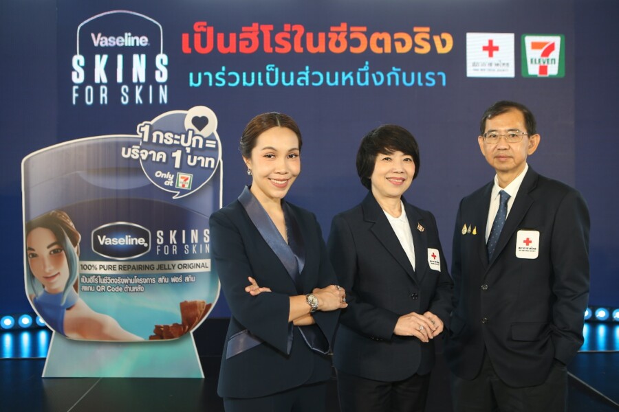 นางจันทร์ประภา วิชิตชลชัย รองผู้อำนวยการสำนักงานจัดหารายได้ สภากาชาดไทย กล่าวว่า “สภากาชาดไทยมีภารกิจในการให้บริการรักษาพยาบาล ฟื้นฟูสภาพ สร้างเสริมสุขภาพและป้องกันโรคให้แก่ประชาชน โดยได้จัดตั้งธนาคารผิวหนัง (Skin bank) ขึ้นครั้งแรกในประเทศไทยเมื่อปี พ.ศ. 2558 เพื่อจัดเก็บผิวหนังจากผู้บริจาคอวัยวะและเนื้อเยื่อที่เสียชีวิตสำหรับให้บริการแก่โรงพยาบาลต่างๆ ทั่วประเทศ ที่ต้องการนำไปใช้รักษาแผลผู้ป่วยไฟไหม้ น้ำร้อนลวก หรือประสบอุบัติเหตุขั้นรุนแรง เพื่อช่วยบรรเทาความเจ็บปวดและลดโอกาสพิการหรือเสียชีวิต พร้อมทั้งเพิ่มโอกาสกลับไปใช้ชีวิตได้ตามปกติให้แก่ผู้ป่วย แต่ผิวหนังสำรองในธนาคารผิวหนังของสภากาชาดไทยกำลังตกอยู่ในสภาวะขาดแคลนจนไม่สามารถส่งมอบให้กับโรงพยาบาลต่างๆ นำไปใช้รักษาผู้ป่วยได้ในทันที การสร้างการรับรู้เกี่ยวกับการบริจาคผิวหนังจึงเป็นวาระสำคัญเร่งด่วนที่ต้องได้รับการส่งเสริมจากทุกภาคส่วนให้เกิดขึ้นอย่างเป็นรูปธรรม ในโอกาสนี้ สภากาชาดไทยขอขอบคุณวาสลีนที่ได้ริเริ่มโครงการสกินส์ ฟอร์ สกิน และขอบคุณเซเว่น อีเลฟเว่น ที่อำนวยความสะดวกเป็นช่องทางจัดจำหน่ายผลิตภัณฑ์ ‘วาสลีน ปิโตรเลียม เจลลี่ ลิมิเต็ด อิดิชัน’ เพื่อระดมเงินทุนสนับสนุนการดำเนินงานของศูนย์รับบริจาคอวัยวะ สภากาชาดไทย ร่วมถ่ายทอดภารกิจของสภากาชาดไทยผ่านโครงการ “สกินส์ ฟอร์ สกิน” ที่เป็นจุดเริ่มต้นในการดูแลผิวเพื่อสร้างความสำคัญและเกิดคุณค่าเมื่อได้ร่วมบริจาคผิวหนังเพื่อผู้ป่วยที่ได้รับผลกระทบจากเหตุการณ์ต่างๆ เพื่อให้พวกเขาได้มีโอกาสใช้ชีวิตได้อย่างมีความสุขต่อไป”