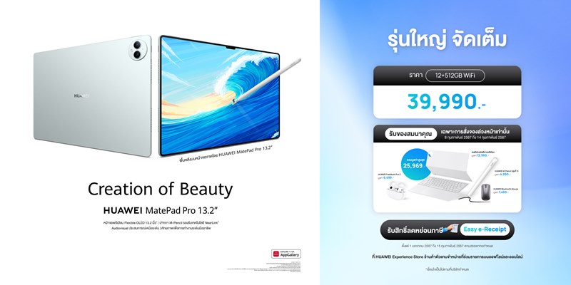HUAWEI MatePad Pro 13.2″ ความจุ 12+512GB วางจำหน่ายในราคา 39,990 บาท พรีออเดอร์ตั้งแต่วันที่ 8 กพ 2567 – 14 กพ 2567 รับฟรีเคสคีย์บอร์ดสีขาว มูลค่า 12,990 บาท HUAWEI FreeBuds Pro 2 มูลค่า 6,499 บาท ปากกา HUAWEI M-Pencil (รุ่นที่ 3) มูลค่า 4,990 บาท และ HUAWEI Bluetooth Mouse มูลค่า 1,490 บาท ทางหน้าร้าน HUAWEI Experience Store และร้านค้าตัวแทนจำหน่ายที่ร่วมรายการ รวมทั้งช่องทางออนไลน์บนเว็บไซต์ HUAWEI Store ร้านค้าอย่างเป็นทางการของหัวเว่ยบนแพลตฟอร์ม Lazada และ Shopee