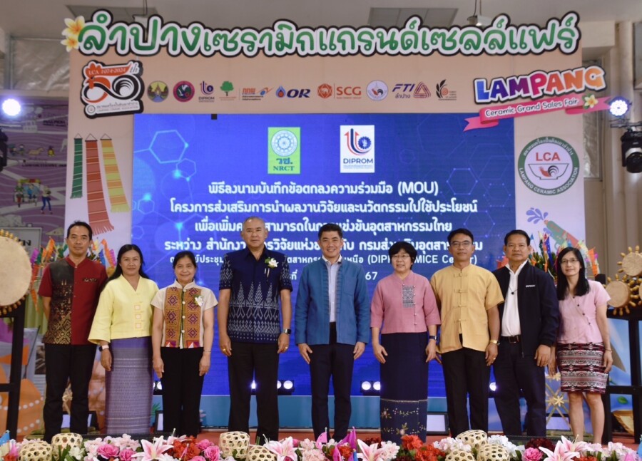 10 เมษายน 2567 สำนักงานการวิจัยแห่งชาติ (วช.) กระทรวงการอุดมศึกษา วิทยาศาสตร์ วิจัยและนวัตกรรม ผนึกกำลัง กรมส่งเสริมอุตสาหกรรม (กสอ.) หรือ DIPROM (ดีพร้อม) ลงนามความร่วมมือส่งเสริมการใช้งานวิจัยเพื่อสนับสนุนและเพิ่มมูลค่าให้กับผู้ประกอบการภาคอุตสาหกรรม โดยนำร่องอุตสาหกรรมเซรามิก จังหวัดลำปาง ด้วยการพัฒนาผู้ประกอบการอุตสาหกรรมเซรามิกดั้งเดิมเปลี่ยนมาเป็นผู้ประกอบการอุตสาหกรรมเซรามิกขั้นสูง ในครั้งนี้ ดร.วิภารัตน์ ดีอ่อง ผู้อำนวยการสำนักงานการวิจัยแห่งชาติ ได้มอบหมายให้ นายสมปรารถนา สุขทวี รองผู้อำนวยการสำนักงานการวิจัยแห่งชาติ ลงนามความร่วมมือกับ นายภาสกร ชัยรัตน์ อธิบดีกรมส่งเสริมอุตสาหกรรม โดยมี นายวัชรุน จุ้ยจำลอง รองอธิบดีกรมส่งเสริมอุตสาหกรรม และนางสุภาพร โชคเฉลิมวงศ์ ผู้อำนวยการกองบริหารทุนวิจัยและนวัตกรรม 1 เป็นสักขีพยานในการลงนาม พร้อมนี้ นางสาวนิติยา พงษ์พานิช รองผู้ว่าราชการจังหวัดลำปาง ให้เกียรติเข้าร่วมงานในครั้งนี้ ณ ศูนย์ประชุมและแสดงสินค้าอุตสาหกรรมภาคเหนือ (DIPROM MICE CENTER) จังหวัดลำปาง