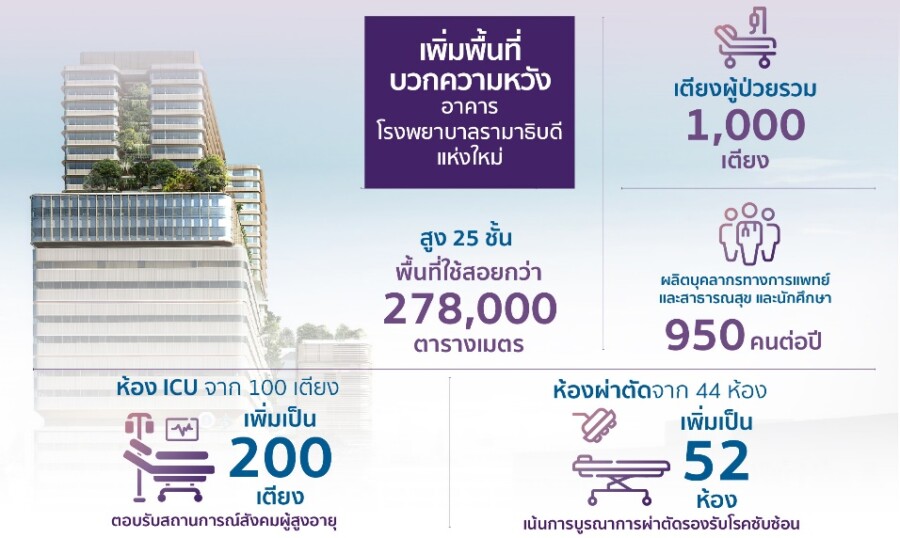 โครงการอาคารโรงพยาบาลรามาธิบดี และย่านนวัตกรรมโยธี ออกแบบภายใต้แนวคิด “เข้าใจเขา เข้าใจเรา เข้าใจทุก(ข์)คน” เพื่อตอบโจทย์ความต้องการทั้งผู้ป่วยและบุคลากรทางการแพทย์ รวมถึงการแก้ไขปัญหาด้านความแออัดของพื้นที่อาคารเดิม โดยตั้งเป้าหมายการระดมทุนเพิ่มเติมจากการสนับสนุนของภาครัฐบาลรวมจำนวน 9,000 ล้านบาท เพื่อนำไปใช้ดำเนินการก่อสร้างอาคารโรงพยาบาลและการจัดซื้อเครื่องมือทางการแพทย์ที่ทันสมัยจำนวนมาก ซึ่งคาดว่าจะแล้วเสร็จในปี 2573