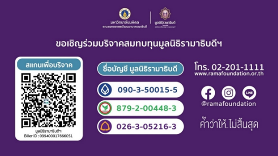มูลนิธิรามาธิบดีฯ ขอเชิญชวนประชาชนผู้มีจิตศรัทธาร่วมเป็นพลังบวกหนึ่งกับโครงการ “รามา+1 เพิ่มพื้นที่ บวกความหวัง” ด้วยการบริจาคเงินสมทบทุนก่อสร้างโครงการอาคารโรงพยาบาลรามาธิบดี และย่านนวัตกรรมโยธี
