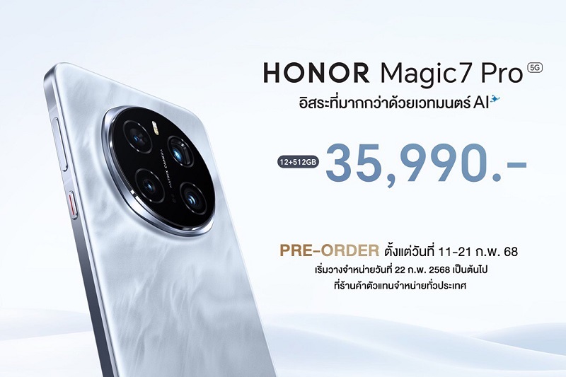 11 กุมภาพันธ์ 2568, กรุงเทพฯ – ออเนอร์ (HONOR) ผู้ให้บริการอุปกรณ์อัจฉริยะชั้นนำระดับโลก ประกาศเปิดตัวสมาร์ตโฟนระดับแฟลกชิป HONOR Magic7 Pro 5G อย่างเป็นทางการ ภายใต้สโลแกน “อิสระที่มากกว่าด้วยเวทมนต์ AI” โดดเด่นด้วยเทคโนโลยีกล้อง AI สุดล้ำที่ปฏิวัติการถ่ายภาพได้อย่างสมบูรณ์แบบ ด้วยความสามารถเหนือชั้นกับกล้องเทเลโฟโต้ถ่ายภาพคมชัดความละเอียด 200 ล้านพิกเซล ผสานพลัง AI Motion Sensing Capture ตัวช่วยเก็บภาพเคลื่อนไหวในทุกอารมณ์ได้อย่างไร้ที่ติ พร้อมเสริมเกราะความปลอดภัยด้วย AI Deepfake Detection เทคโนโลยีอัจฉริยะที่ช่วยตรวจจับและป้องกันภาพปลอมแปลงอัตโนมัติได้อย่างแม่นยำ ตลอดจนก้าวข้ามกำแพงภาษาด้วย AI Translation ที่เปลี่ยนทุกการสนทนาให้ไร้ข้อจำกัด แปลภาษาได้แบบเรียลไทม์ เพื่อการสื่อสารที่ราบรื่นและง่ายกว่าที่เคย เปิดตัวในราคา 35,990 บาท* โดยเปิดให้พรีออเดอร์ พร้อมรับข้อเสนอสุดพิเศษทั้งออนไลน์และออฟไลน์ได้แล้วตั้งแต่วันนี้ – 21 กุมภาพันธ์ 2568