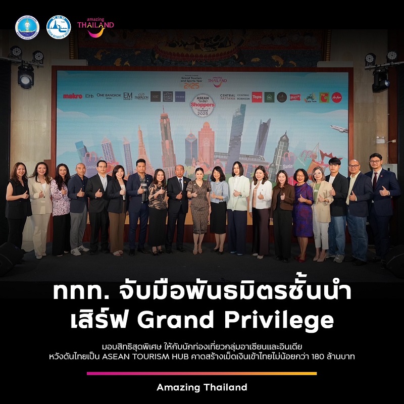 เมื่อวันที่ 13 กุมภาพันธ์ 2568 ณ ห้องโถงธนรัชต์ อาคาร ททท. กระทรวงการท่องเที่ยวและกีฬา โดยการท่องเที่ยวแห่งประเทศไทย (ททท.) เปิดตัวโครงการ ASEAN + INDIA SHOPPERS IN THAILAND 2025 อีกหนึ่งโครงการภายใต้แคมเปญ Amazing Thailand Grand Tourism and Sports Year 2025 โดยมี นางสาวฐาปนีย์ เกียรติไพบูลย์ ผู้ว่าการการท่องเที่ยวแห่งประเทศไทย (ททท.) ให้เกียรติเป็นประธานในพิธี พร้อมด้วยคุณสราวุธ มนูทัศน์ ผู้อำนวยการส่วนงานธุรกิจตลาดนักท่องเที่ยว บริษัท คิง เพาเวอร์ คอร์ปอเรชั่น จำกัด คุณดลลัชนัย สุทธารมณ์ ผู้ช่วยกรรมการผู้จัดการฝ่ายการตลาดต่างประเทศ บริษัท เซ็นทรัลพัฒนา จำกัด (มหาชน) คุณทิพมาศ เกษี ผู้ช่วยกรรมการผู้จัดการฝ่ายการตลาด International Customers and Strategic Partnerships กลุ่มห้างสรรพสินค้าเซ็นทรัล ในเครือเซ็นทรัลรีเทล และนางสาวภัทรอนงค์ ณ เชียงใหม่ รองผู้ว่าการด้านตลาดเอเชีย และแปซิฟิกใต้ พร้อมหน่วยงานพันธมิตร ให้เกียรติเข้าร่วมงานฯ