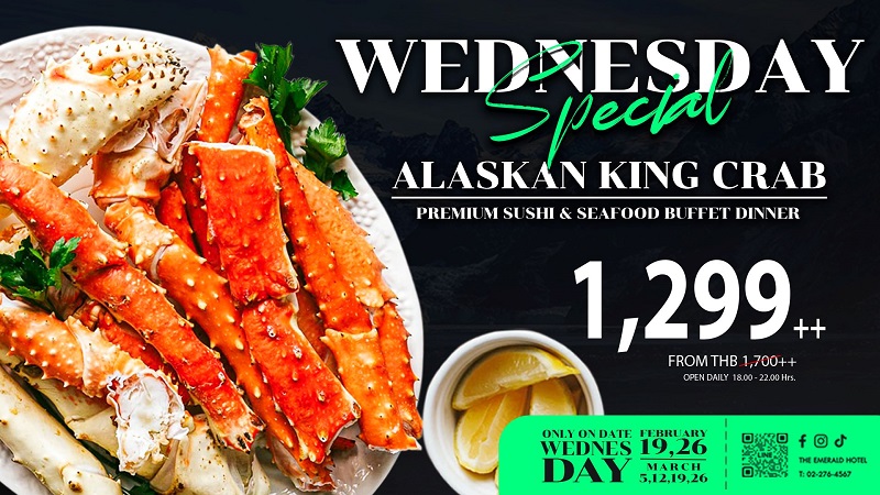 คนรักอาหารทะเลต้องไม่พลาดกับ “Alaskan King Crab Night” ทุกมื้อเย็นวันพุธ (วันที่ 19, 26 กุมภาพันธ์ และ 5,12,19,26 มีนาคม 2568) ระหว่าง เวลา 18.00 – 22.00 น. ที่บริการรวมวัตถุดิบนานาชาติชั้นนำให้อร่อยได้ไม่อั้นทั้ง ขาปูอลาสก้า หอยนางรม กุ้งเม่น้ำ หอยหวาน ปูม้า ฯลฯ และยังมีอาหารญี่ปุ่นมากมาย โดยเฉพาะสายปลาดิบกับซาชิมิ “ทูน่าบลูฟิน” ปลาฮามาจิ ซูชิฟัวกราส์ วากิว แซลมอน ปลาไหลญี่ปุ่น ความอร่อยที่พลาดไม่ได้