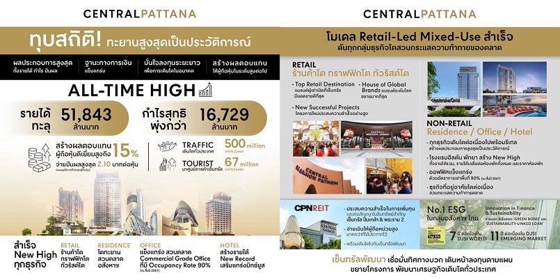 นางสาวนภารัตน์ ศรีวรรณวิทย์ Chief Finance, Accounting and Risk Management Officer บมจ. เซ็นทรัลพัฒนา กล่าวว่า “ผลประกอบการใน ปี 2567 ของบริษัทฯ เติบโตดีเยี่ยมในทุกกลุ่มธุรกิจ ทั้งศูนย์การค้า โครงการที่อยู่อาศัย อาคารสำนักงาน และโรงแรมทั่วประเทศ โดยบริษัทฯ ได้รายงานงบการเงินปี 2567 ด้วยตัวเลขที่สูงสุดเป็นประวัติการณ์ มีรายได้รวมที่ 51,843 ล้านบาท และกำไรสุทธิ 16,729 ล้านบาท เติบโต 11% จากปีก่อนหน้า พร้อมสร้างผลตอบแทนผู้ถือหุ้นสูงถึง 15% รวมทั้งประกาศจ่ายปันผลสูงสุดเป็นประวัติการณ์ 2.1 บาทต่อหุ้น* โดยบริษัทฯ มีฐานะทางการเงินแข็งแกร่ง พร้อมเดินหน้าลงทุนสร้างการเติบโตและผลตอบแทนระดับสูงแก่ผู้ถือหุ้นต่อไป สะท้อนวิสัยทัศน์ระยะยาวของบริษัทในการดำเนินธุรกิจด้วยความยั่งยืน ลงทุนต่อเนื่อง มีความมั่นคงทางการเงิน ด้วยวินัยทางการเงินที่ดี และกลยุทธ์การดำเนินธุรกิจที่ดีที่ให้ผลตอบแทนแก่ทุก Stakeholders” (* ตัวเลขเพื่อนำเสนอและรอการอนุมัติจากผู้ถือหุ้น)