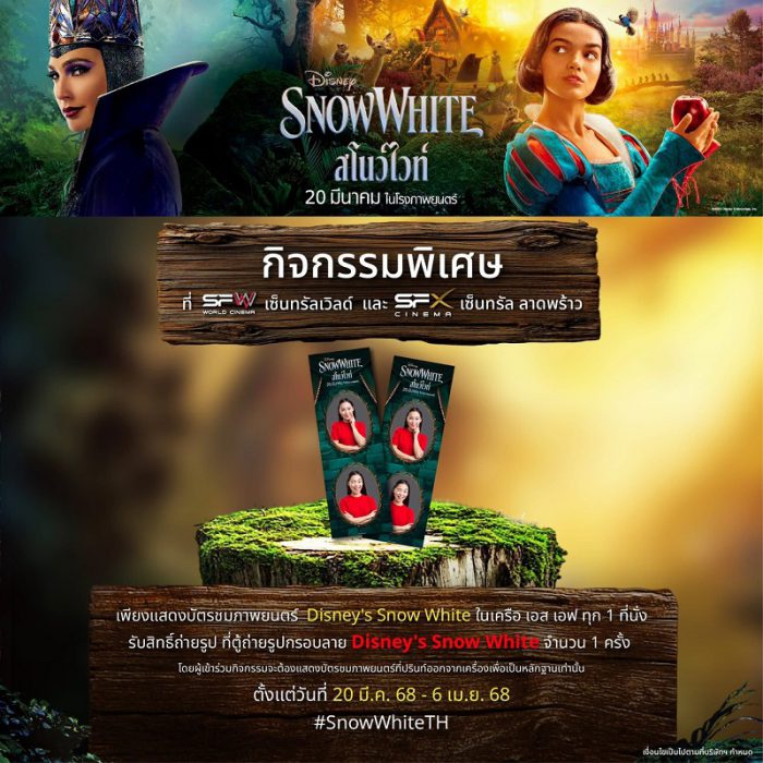 และสำหรับแฟน ๆ ที่รักการถ่ายรูป ร่วมสนุกกับการถ่ายรูปกับกรอบลาย Disney’s Snow White ได้ที่ Major Ratchayothin ตั้งแต่วันที่ 20 – 29 มีนาคม 2568 รวมถึงที่ SF World Cinema และ SFX Central Ladprao ตั้งแต่วันที่ 20 มีนาคม – 6 เมษายน 2568 เพียงแสดงบัตรชมภาพยนตร์ Snow White ทุก 1 ที่นั่ง รับสิทธิ์ถ่ายรูปสวย ๆ กับกรอบลาย Disney’s Snow White ได้ 1 ครั้ง