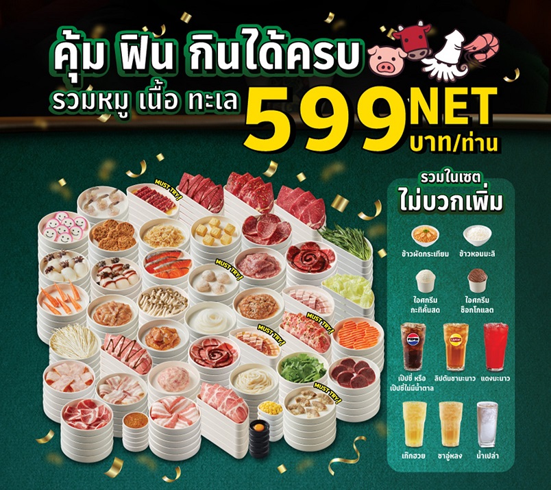 – BUFFET รวมหมู เนื้อ ทะเล ราคา 599 บาท NET/คน ทานได้ไม่อั้นกว่า ไอศกรีมไม่อั้นในเซต 56 เมนู รวมข้าว น้ํา