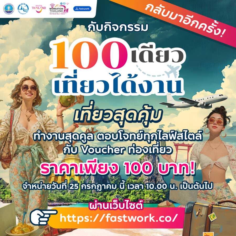 การท่องเที่ยวแห่งประเทศไทย (ททท.) เดินหน้าขับเคลื่อนยุทธศาสตร์การท่องเที่ยวเชิงคุณภาพอย่างต่อเนื่อง ด้วยการเปิดตัวกิจกรรม “100 เดียวเที่ยวได้งาน” อีกหนึ่งแคมเปญสำคัญภายใต้โครงการ Workation Paradise Throughout Thailand Season 3 เพื่อรองรับพฤติกรรมของกลุ่มนักท่องเที่ยวคนทำงานยุคใหม่ โดยเฉพาะ Freelancers, Digital Nomads และ Expat ที่สามารถทำงานจากที่ใดก็ได้ พร้อมเปิดประสบการณ์การเดินทางและการทำงานควบคู่กันทั่วประเทศไทย โดยการจัดกิจกรรมในครั้งนี้ได้ผนึกกำลังกับ Fastwork แพลตฟอร์มดิจิทัลชั้นนำด้านฟรีแลนซ์ของไทย ซึ่งมีฐานผู้ใช้งานกว่า 1 ล้านคน เพื่อขยายฐานการสื่อสารไปยังกลุ่มเป้าหมายหลัก และสร้างแรงจูงใจให้เกิดการเดินทางผ่านรูปแบบการทำงานที่ไม่ยึดติดกับสถานที่ (Work from Anywhere) พร้อมนำเสนอ Voucher สินค้าและบริการด้านการท่องเที่ยวในราคาสุดพิเศษเพียง 100 บาท โดยมีสถานประกอบการเข้าร่วมจากทั่วประเทศ ทั้งโรงแรม รีสอร์ท สวนน้ำ ร้านอาหาร สปา และกิจกรรมท่องเที่ยวหลากหลายรูปแบบ