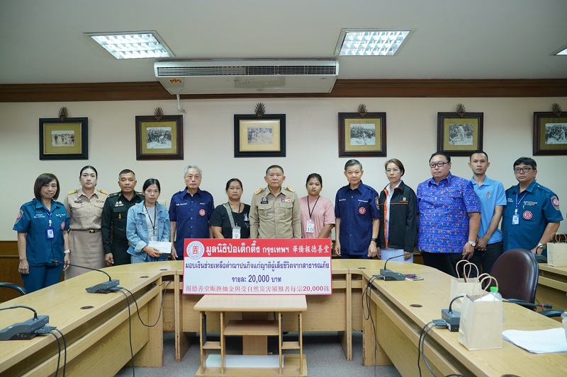 วานนี้ (วันศุกร์ที่ 8 สิงหาคม พ.ศ. 2568) มูลนิธิป่อเต็กตึ๊ง นำโดย นายวิชิต ชินวงศ์วรกุล รองประธานกรรมการ พร้อมด้วย นายชาญกิจ วิทยาวรากรณ์ กรรมการ นำทีมแผนกสาธารณภัย ฝ่ายสังคมสงเคราะห์ นำโดย นางศิริพร กระจ่างหล้า ผู้จัดการฝ่ายสังคมสงเคราะห์ และ นายรัชพร ประสงค์ทรัพย์ หัวหน้าแผนกสาธารณภัย เข้าเยี่ยมเยียนพร้อมให้กำลังใจแก่ผู้บาดเจ็บและญาติผู้เสียชีวิตจากเหตุโรงงานพลุระเบิด ตำบลบ้านโพธิ์ อำเภอเมือง จังหวัดสุพรรณบุรี โดยมอบเงินปลอบขวัญจำนวน 1 รายๆ ละ 5,000 บาท และมอบเงินช่วยเหลือค่าฌาปนกิจแก่ครอบครัวผู้เสียชีวิต รวม 9 รายๆ ละ 20,000 บาท รวมงบประมาณการช่วยเหลือทั้งสิ้น 185,000 บาท (หนึ่งแสนแปดหมื่นห้าพันบาทถ้วน) โดยมี นายพิริยะ ฉันทดิลก ผู้ว่าราชการจังหวัดสุพรรณบุรี เป็นประธานในพิธี ณ ศาลากลางจังหวัดสุพรรณบุรี อำเภอเมือง จังหวัดสุพรรณบุรี