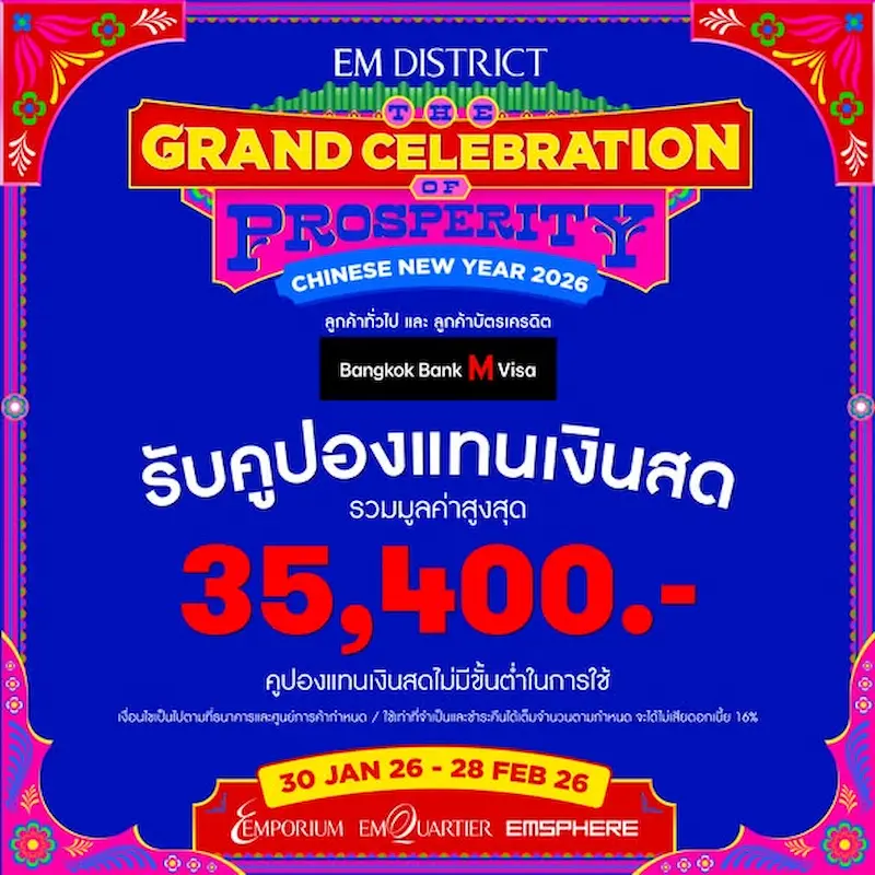 เอ็ม ดิสทริค (ศูนย์การค้าเอ็มโพเรียม เอ็มควอเทียร์ และเอ็มสเฟียร์) ร่วมกับพันธมิตรธุรกิจชั้นนำ อาทิ บัตรเครดิต Bangkok Bank M Visa, BOWINS SILVER, Iceland Spring, LocknLock และ Ninest จัดแคมเปญอภิมหาโปรโมชัน “EM DISTRICT: THE GRAND CELEBRATION OF PROSPERITY CHINESE NEW YEAR 2026” ระหว่างวันที่ 30 ม.ค. 69 – 28 ก.พ. 69 ต้อนรับเทศกาลตรุษจีนปีมะเมีย มอบประสบการณ์การช้อปปิ้งควบคู่ความมั่งคั่งและโชคลาภให้กับลูกค้าในทุกมิติ