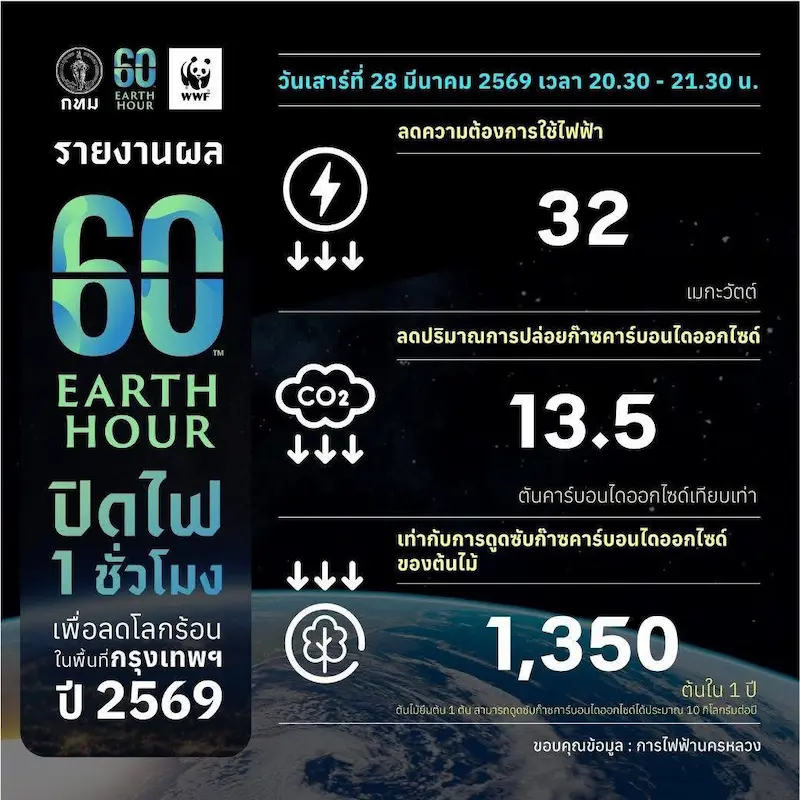● การร่วมปิดไฟในช่วง Earth Hour สามารถช่วยลดการใช้ไฟฟ้าในเมืองใหญ่ได้เฉลี่ย 3–4% หรือราว 73 เมกะวัตต์ภายใน 1 ชั่วโมง เทียบเท่าการลดการปล่อยก๊าซคาร์บอนไดออกไซด์กว่า 40 ตัน สะท้อนพลังของความร่วมมือจากประชาชน ภาครัฐ และภาคธุรกิจ