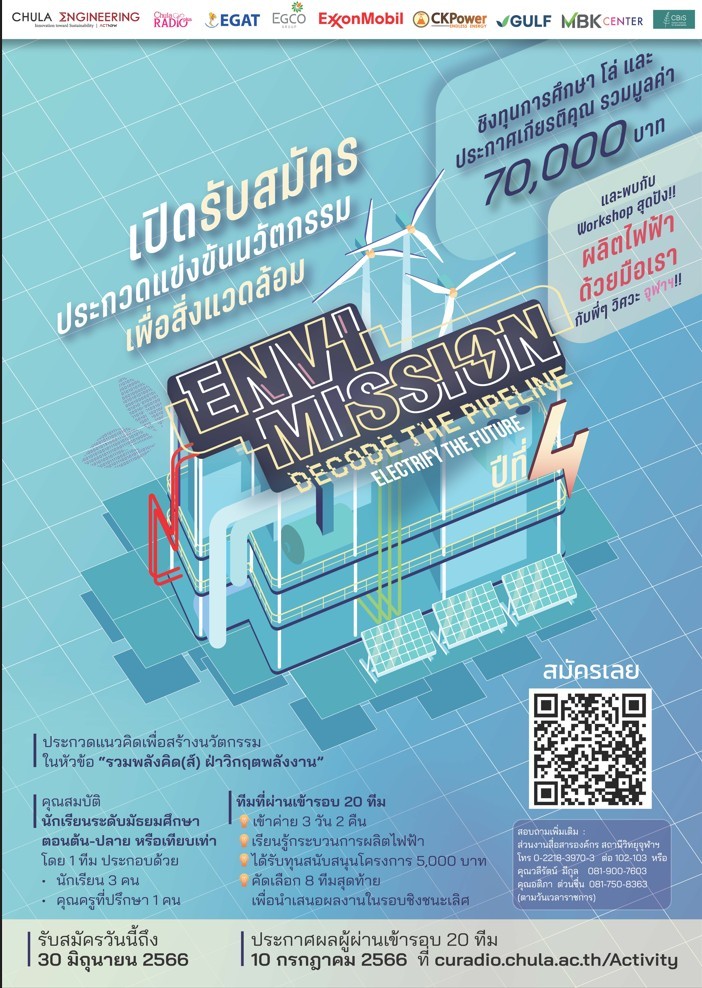 วิศวฯ จุฬาฯ ร่วมกับ สถานีวิทยุจุฬาฯ จัดโครงการ “ Envi Mission ภารกิจรักษ์สิ่งแวดล้อม ปีที่ 4 ” Decode the Pipeline : Electrify the future รวมพลังคิด(ส์) ฝ่าวิกฤตพลังงาน …